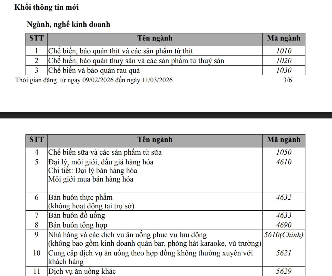 Ngành nghề kinh doanh của doanh nghiệp cũng tăng từ 31 lên 45. Một số ngành lõi là nhà hàng và các dịch vụ ăn uống phục vụ lưu động; chế biến, bảo quản thịt và các sản phẩm từ thịt; chế biến, bảo quản thủy sản và các sản phẩm thủy sản; chế biến sữa và các sản phẩm từ sữa...