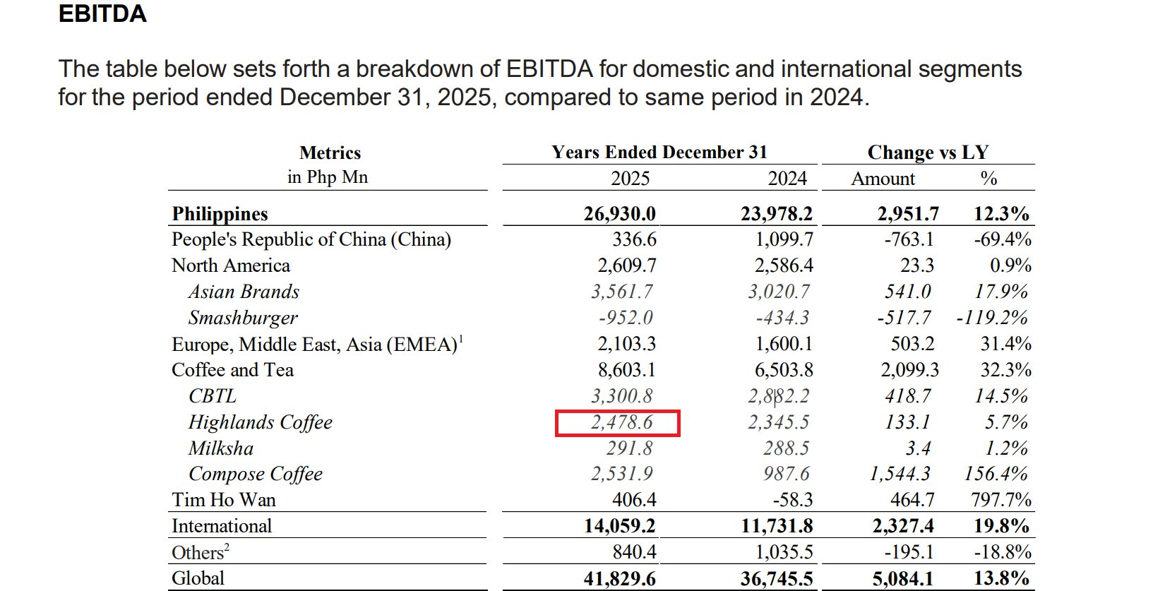 Năm 2023 là năm đầu tiên Jollibee công bố số liệu của riêng Highlands Coffee trong báo cáo. Từ đó, lợi nhuận EBITDA của Highlands Coffee đã tăng 5,7% trong năm 2025 và 4,5% trong năm 2024.
