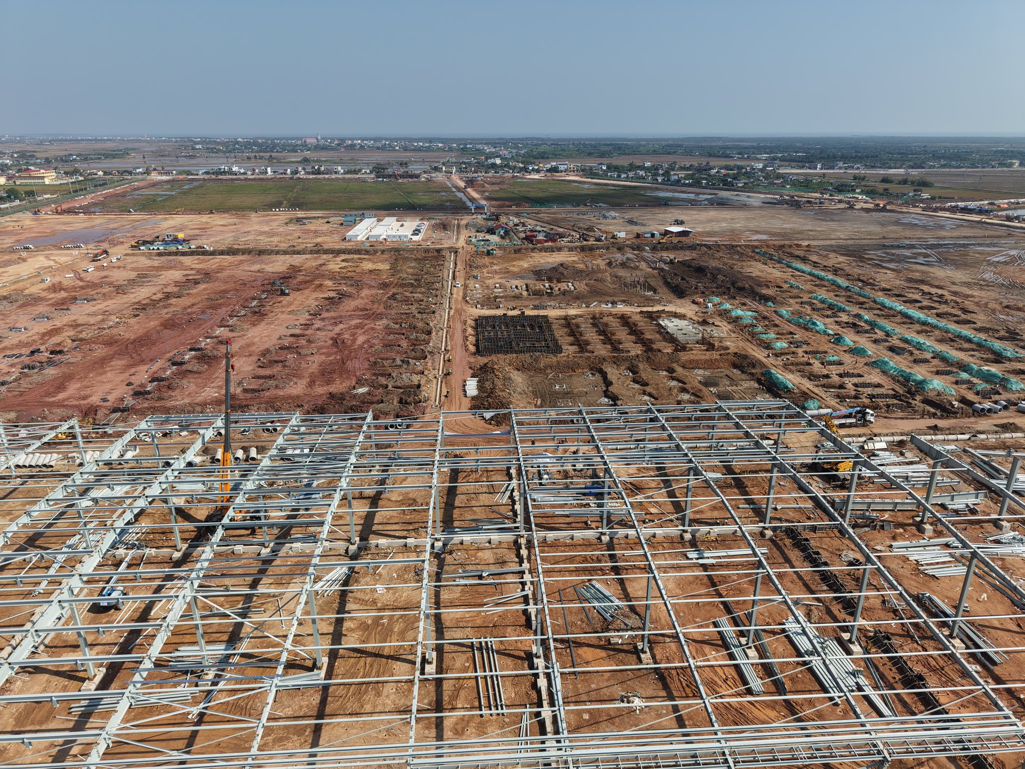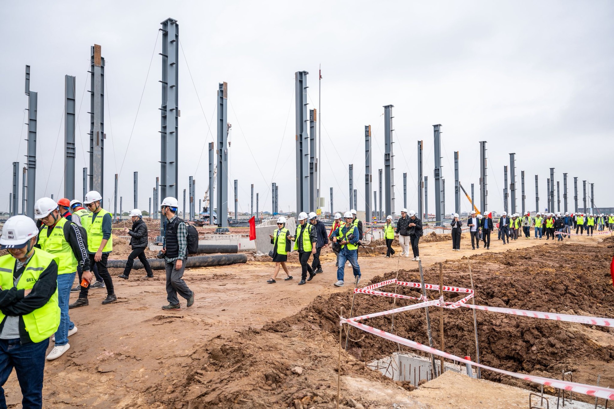 Hiện dự án đã bước sang giai đoạn tăng tốc thi công các hạng mục hạ tầng chính, trong đó phần khung thép của xưởng lắp ráp đã hoàn thiện từ đầu năm 2026.