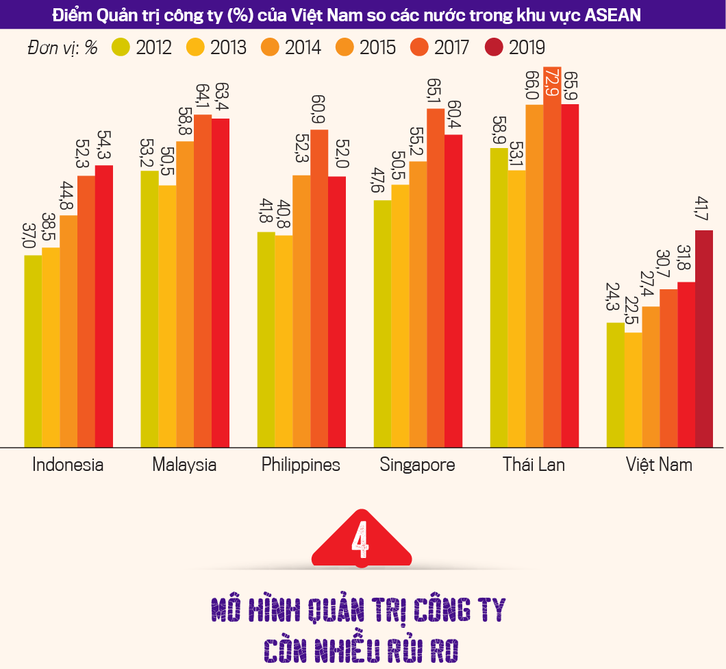 Theo Báo cáo Thẻ điểm Quản trị công ty ASEAN (ACGS) năm 2019, quản trị doanh nghiệp ở Việt Nam ở mức thấp nhất trong 6 nước, bao gồm Singapore, Malaysia, Thái Lan, Philippines và Indonesia.