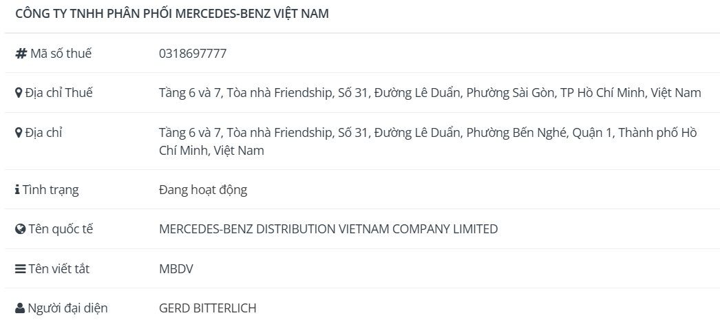 Cụ thể, từ cuối năm 2024, một pháp nhân mới là Công ty TNHH Phân phối Mercedes-Benz Việt Nam (Mã số thuế: 0318697777) đã được thành lập. Doanh nghiệp này có trụ sở chính trùng với địa chỉ nhà máy tại Gò Vấp, do ông Gerd Bitterlich làm người đại diện pháp luật.