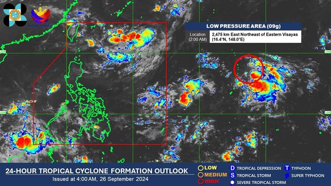 Tin bão của Cục Quản lý Thiên văn, Địa vật lý và Khí quyển Philippines (PAGASA) cho hay, vào hồi 2h ngày 26.9 theo giờ địa phương, vị trí tâm áp thấp (09g) ở vào khoảng 16,4 độ vĩ bắc, 148,0 độ kinh đông, cách Đông Visayas 2.475km về phía đông đông bắc, bên ngoài khu vực dự báo (PAR) của Philippines.