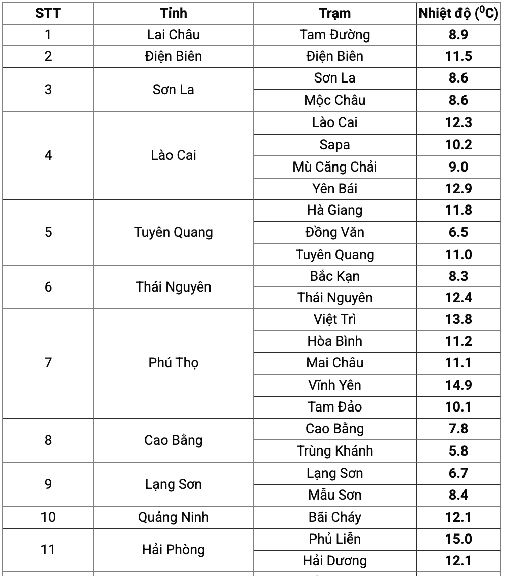 Trung tâm Dự báo Khí tượng Thủy văn Quốc gia cũng đã cập nhật nhiệt độ thực đo sáng nay 12.1 tại một số tỉnh, thành phố.