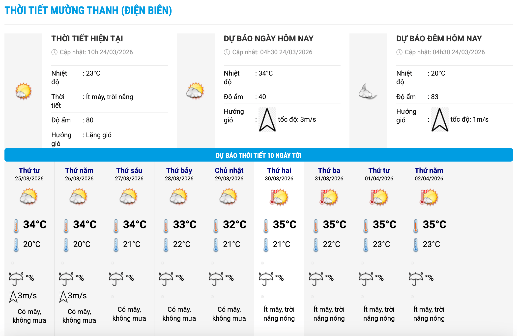 Biểu đồ nhiệt 10 ngày tới cập nhật vào 10 giờ ngày 24.3 cho thấy tại Mường Thanh (Điện Biên) và Hòa Bình (Phú Thọ) cho thấy đầu tuần tới nhiệt độ cao nhất có thể lên đến 35 độ C, thời tiết nắng nóng. Nguồn: Trung tâm Dự báo Khí tượng Thủy văn Quốc gia