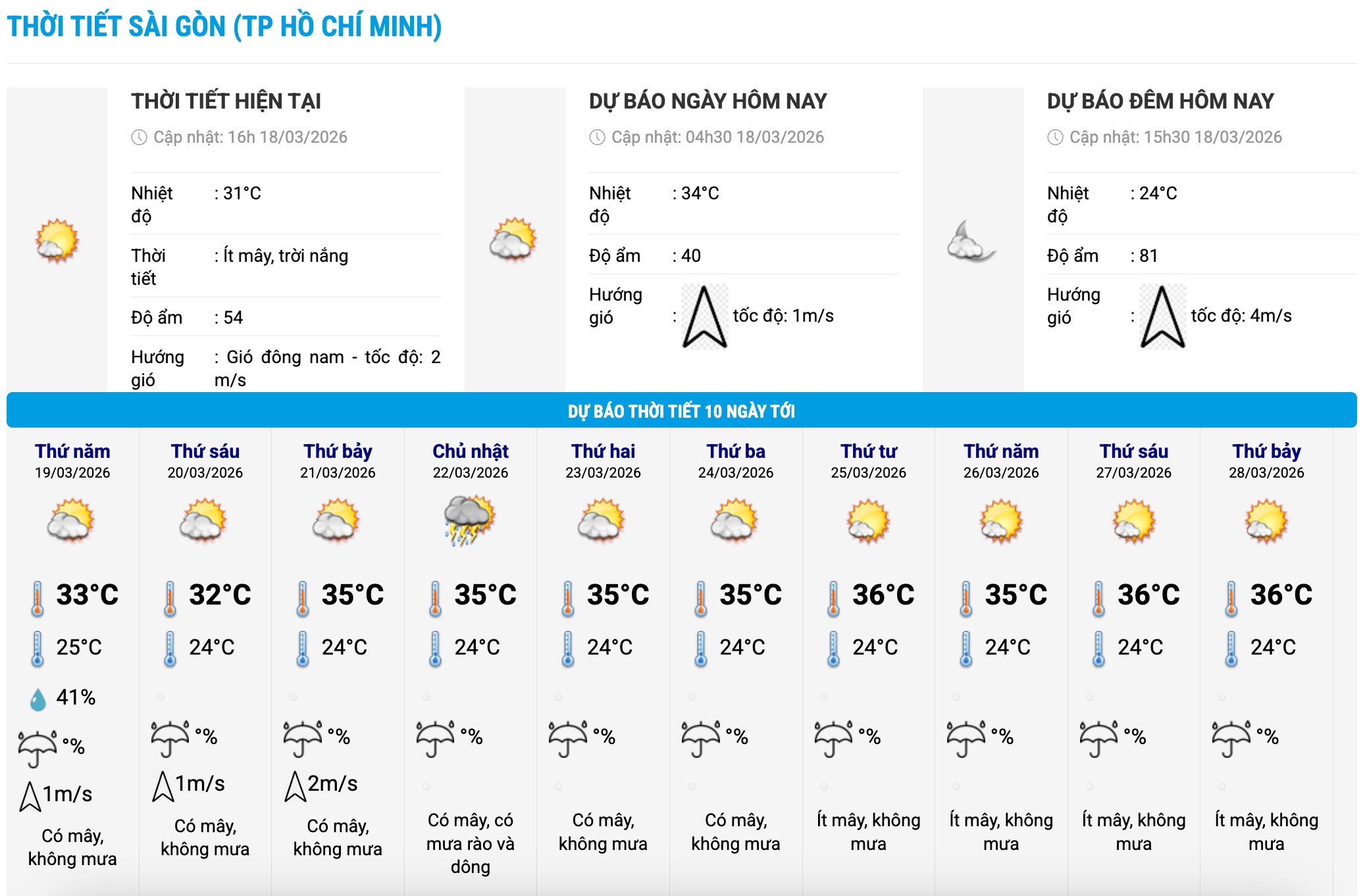 Biểu đồ nhiệt trong 10 ngày tới ở phường Sài Gòn, TPHCM cập nhật vào 16 giờ ngày 18.3. Ảnh: Trung tâm Dự báo Khí tượng Thủy văn Quốc gia