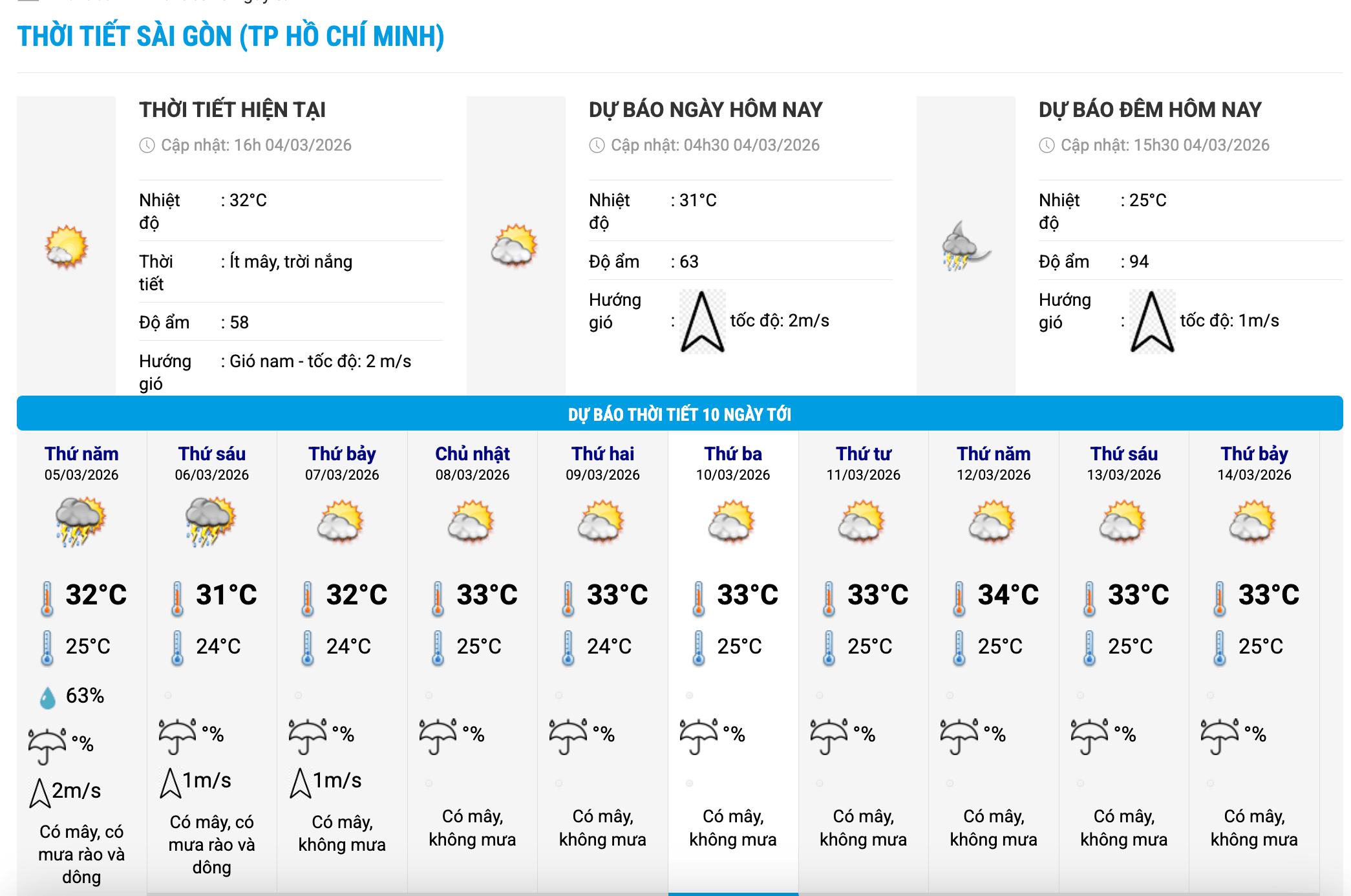 Biểu đồ nhiệt trong 10 ngày tới ở phường Sài Gòn, TPHCM cập nhật vào 16 giờ ngày 4.3. Ảnh: Trung tâm Dự báo Khí tượng Thủy văn Quốc gia
