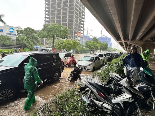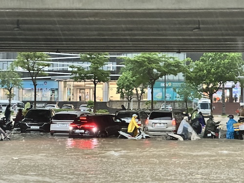 Khu vực Tây Mỗ ngập sâu, nhiều xe chết máy khi cố đi qua chỗ ngập. Ảnh: Hải Nguyễn