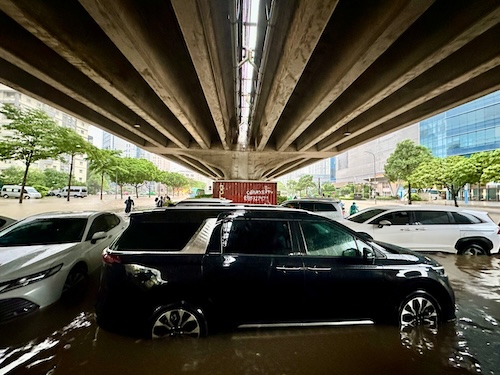 Một ôtô bị ngập sâu ở khu vực Keangnam, xe cứu hộ không thể tiếp cận gần, phải kéo dây để cứu hộ. Ảnh: Phạm Đông
