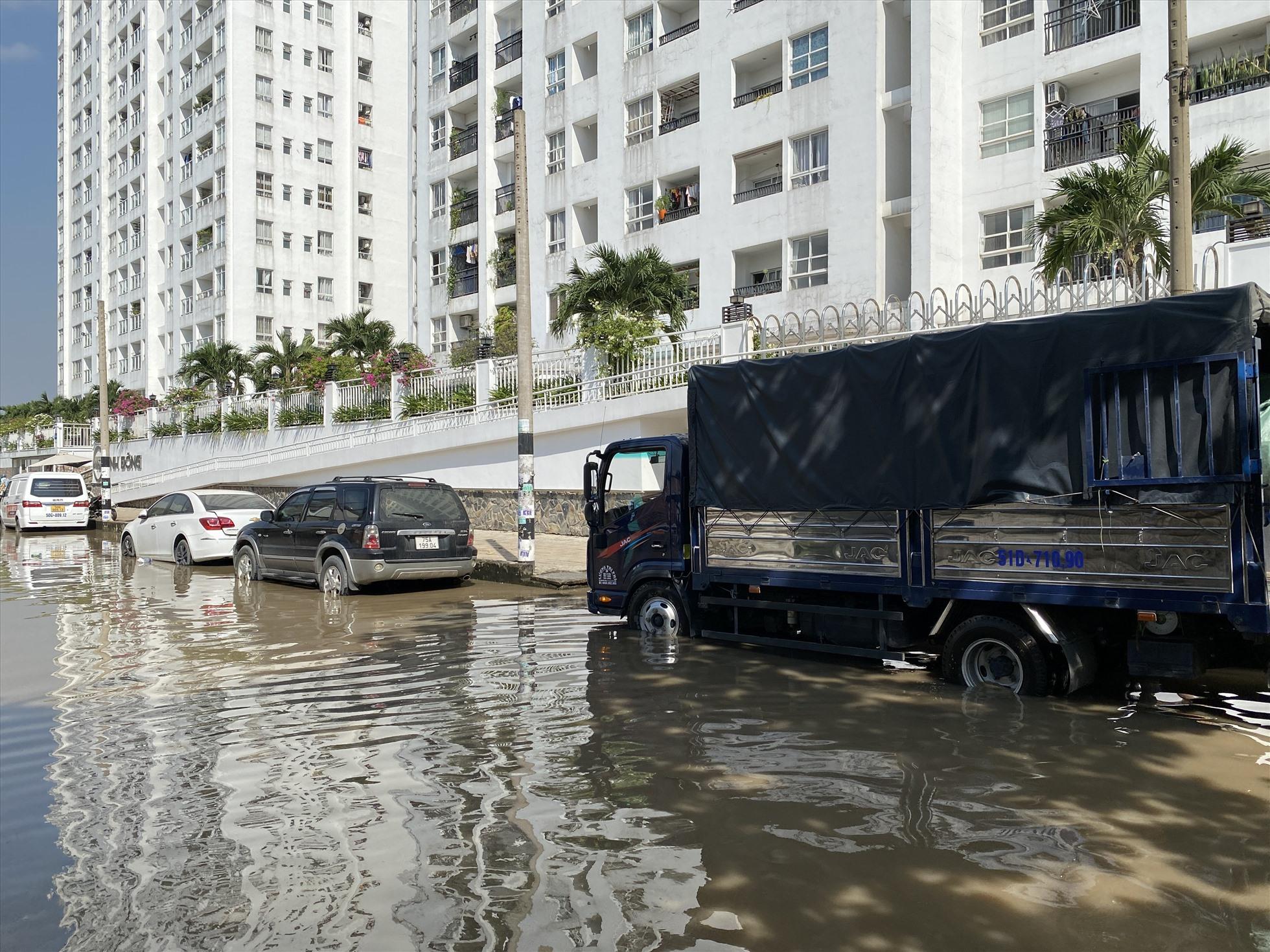 Đến sáng ngày 30.11, đường số 30 (phường Linh Đông, TP Thủ Đức) vẫn đang bị ngập nước sâu do sự cố trong quá trình thi công cống hộp chống ngập xảy ra vào đêm 29.11