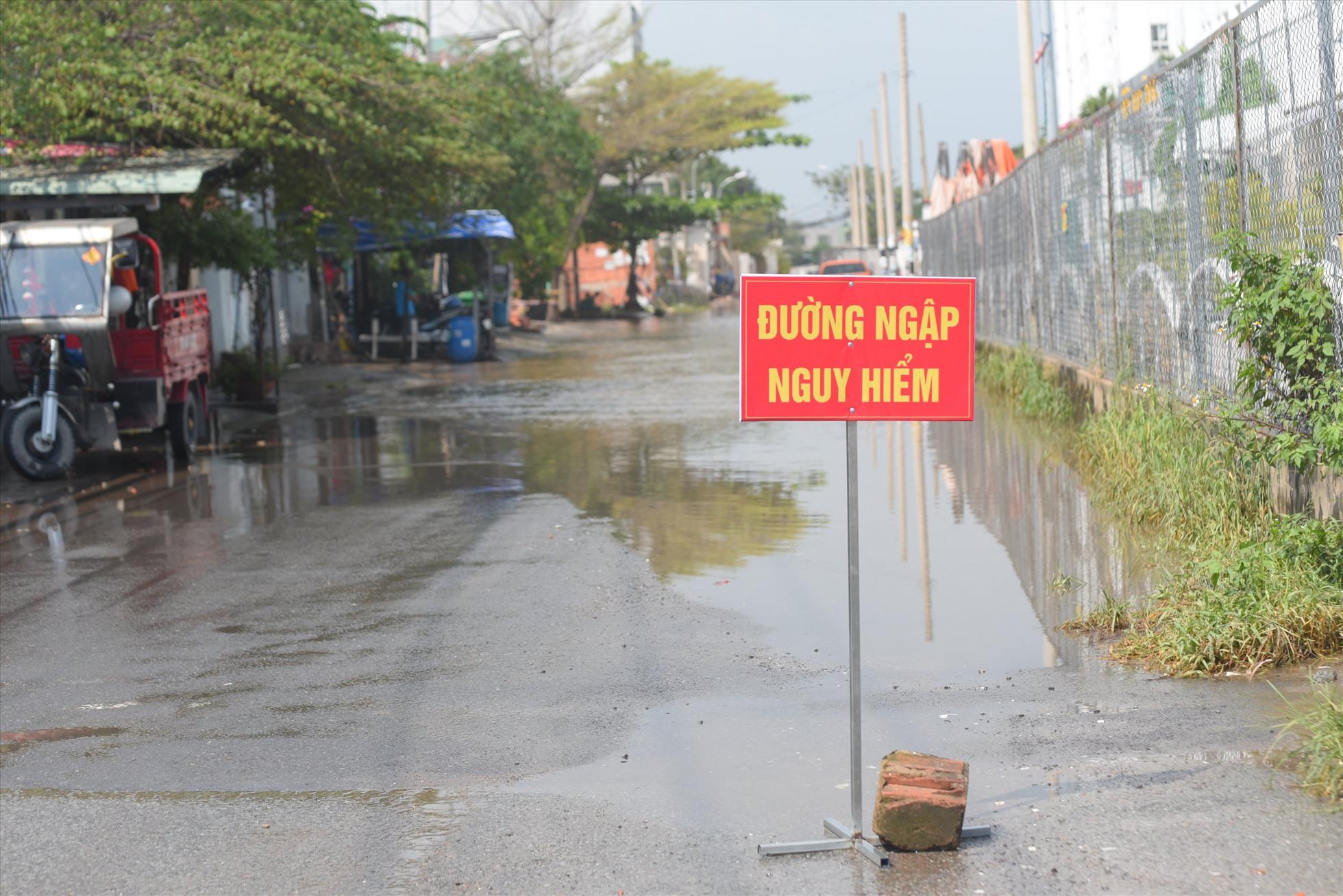 Thông báo "đường ngập nguy hiểm" được đặt đầu đường để cảnh báo người dân khi đi vào con đường này.