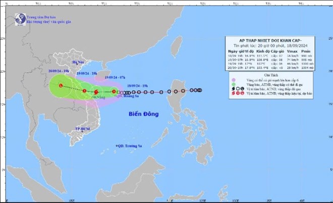 Dự báo vị trí và hướng di chuyển của áp thấp nhiệt đới mạnh lên thành bão số 4. Ảnh: Trung tâm Dự báo khí tượng thủy văn quốc gia
