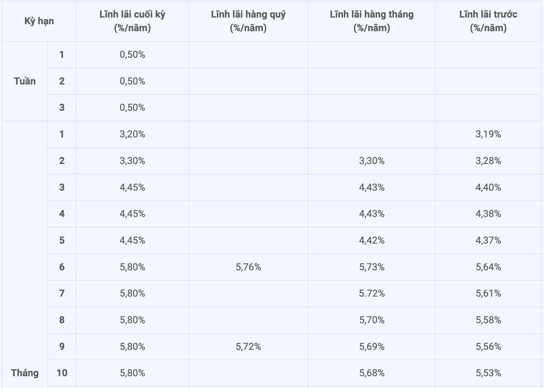 * Thông tin về lãi suất chỉ mang tính chất tham khảo và có thể thay đổi trong từng thời kì. Vui lòng liên hệ điểm giao dịch ngân hàng gần nhất hoặc hotline để được tư vấn cụ thể.
