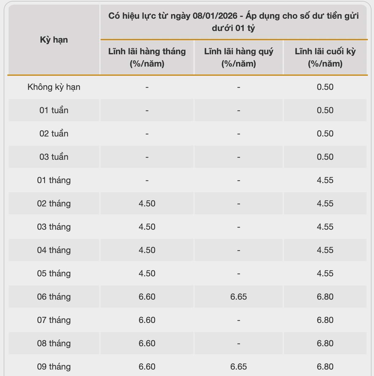 Biểu lãi suất tiết kiệm Vikki Bank. Ảnh: Vikki Bank