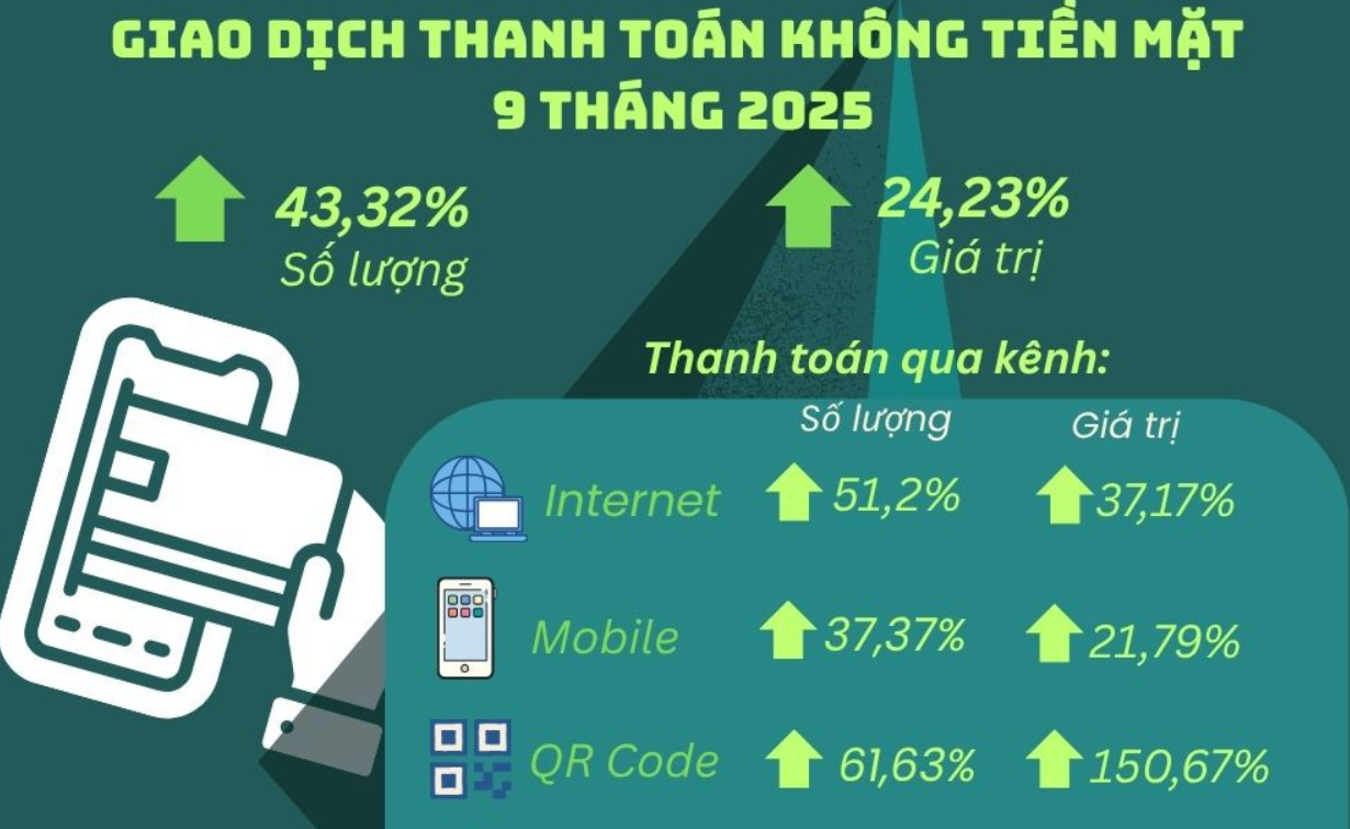 Theo thông tin từ Ngân hàng Nhà nước Việt Nam, 9 tháng năm 2025, giao dịch thanh toán không dùng tiền mặt tăng hơn 43% về số lượng, riêng qua QR Code tăng tới trên 150% về giá trị. Cùng với gần 11 triệu tài khoản Mobile-Money và tỷ lệ 95% giao dịch ngân hàng thực hiện trên kênh số, Việt Nam đang tiến nhanh tới nền kinh tế số toàn diện.