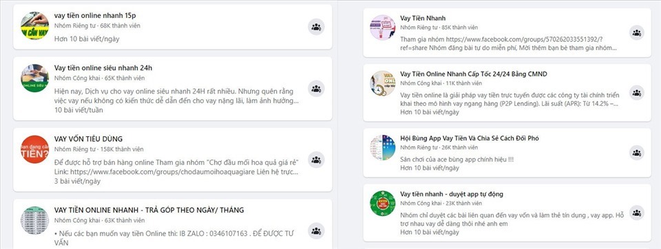 Chỉ cần tìm trên facebook với từ khóa “vay tiền online”, hàng trăm nghìn fanpage hiện ra bủa vây người lao động. Ảnh chụp màn hình