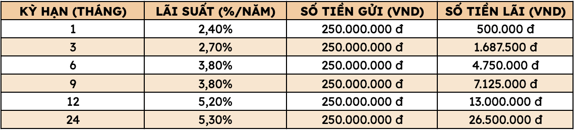 Gửi 250 triệu đồng tại Agribank nhận lãi bao nhiêu tại các kỳ hạn?
