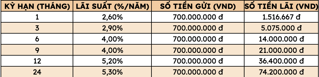 Gửi tiết kiệm 700 triệu đồng tại Agribank nhận lãi bao nhiêu tại các kỳ hạn?