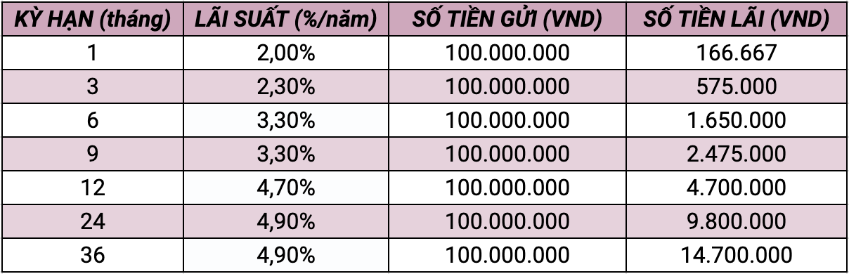 Tiền lãi = Tiền gửi x lãi suất (%)/12 tháng x số tháng gửi.