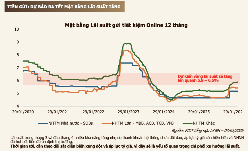Chuyên gia FIDT dự báo lãi suất có thể tăng nhẹ khi thanh khoản hệ thống chịu áp lực từ nhu cầu tín dụng và tác động của tỷ giá. Đồng thời, xu hướng điều chỉnh được dự báo sẽ có sự phân hóa, trong đó nhóm ngân hàng tư nhân và quy mô nhỏ có thể tăng sớm và mạnh hơn so với khối quốc doanh.