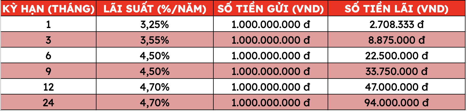 Lãi suất tiền gửi các kỳ hạn 24 - 36 tháng ở mức 4,70%/năm.