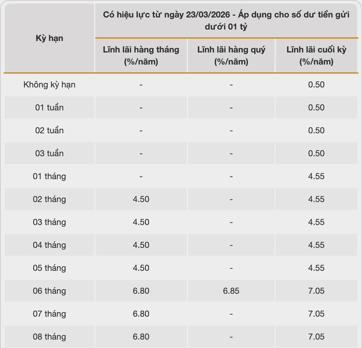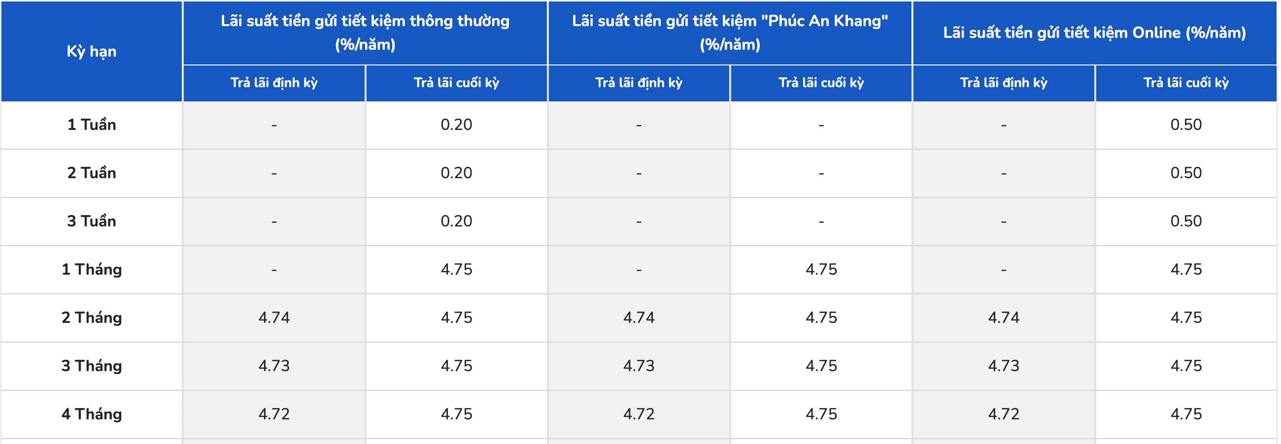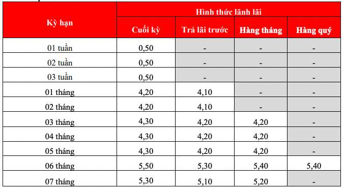 * Thông tin về lãi suất chỉ mang tính chất tham khảo và có thể thay đổi trong từng thời kì. Vui lòng liên hệ điểm giao dịch ngân hàng gần nhất hoặc hotline để được tư vấn cụ thể.