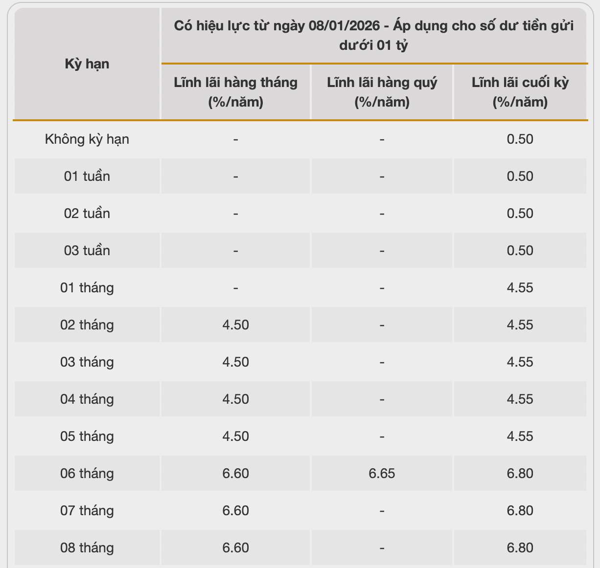 Biểu lãi suất tiết kiệm ngân hàng Vikki Bank. Ảnh: Vikki Bank