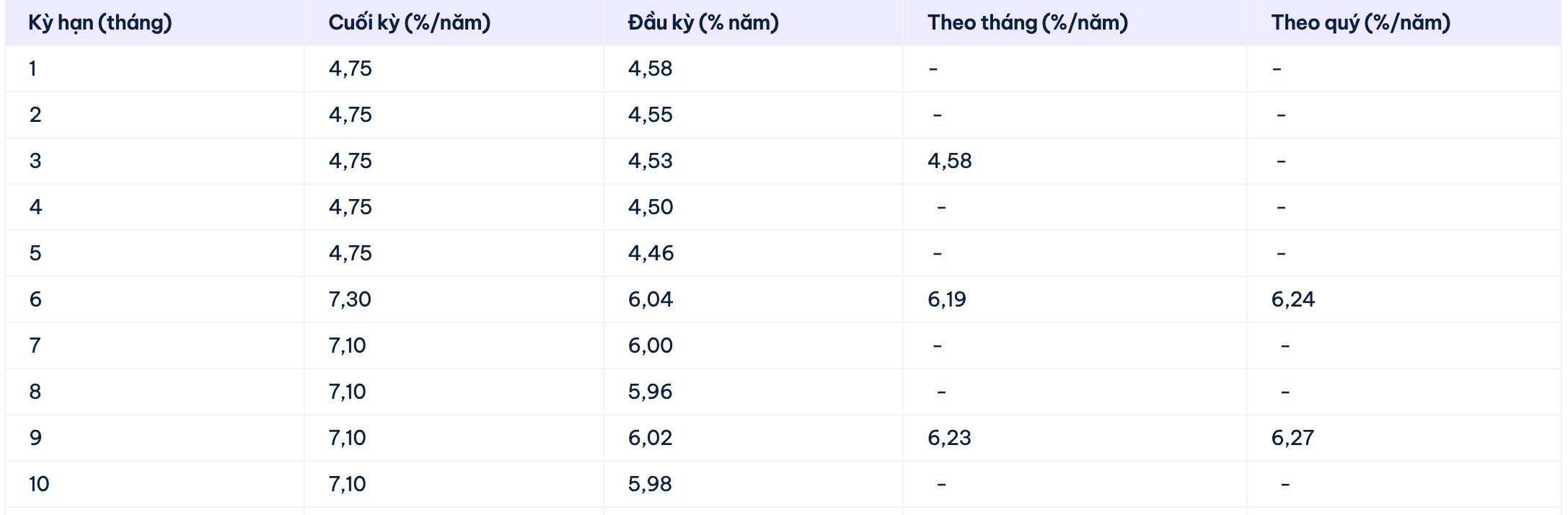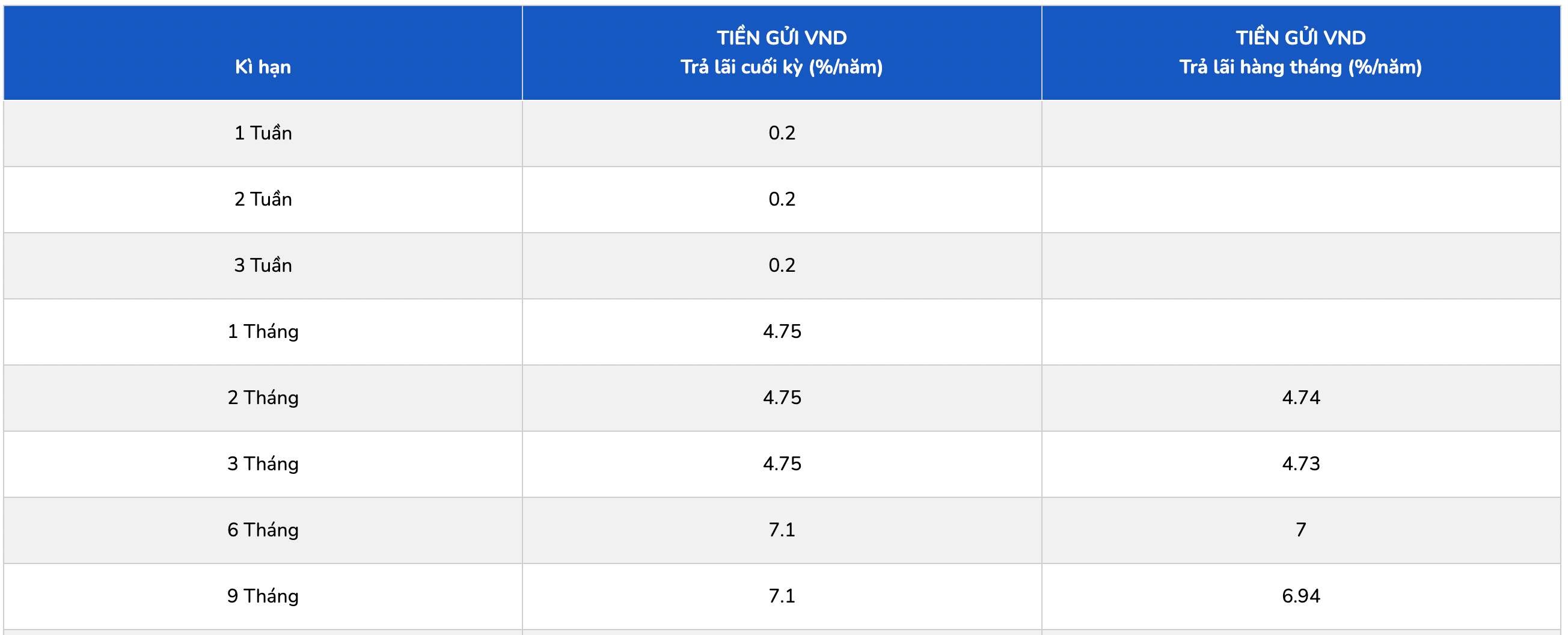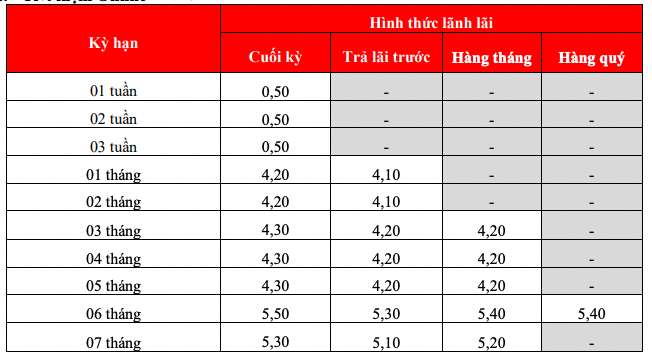 * Thông tin về lãi suất chỉ mang tính chất tham khảo và có thể thay đổi trong từng thời kì. Vui lòng liên hệ điểm giao dịch ngân hàng gần nhất hoặc hotline để được tư vấn cụ thể.