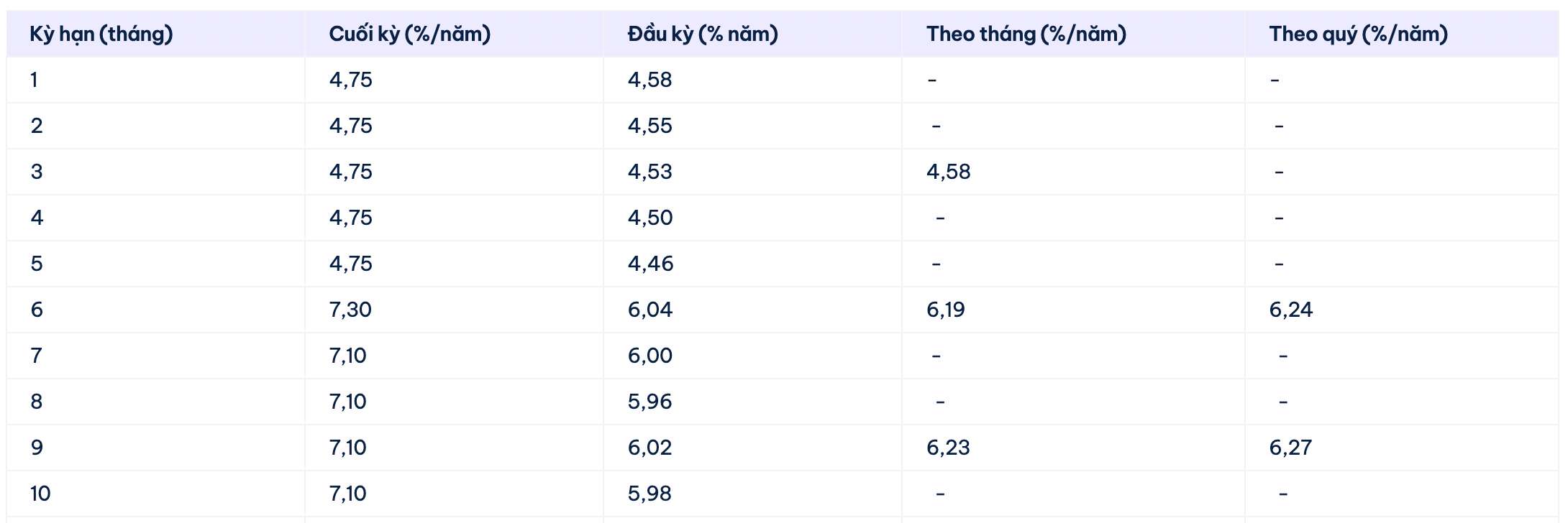 * Thông tin về lãi suất chỉ mang tính chất tham khảo và có thể thay đổi trong từng thời kỳ. Vui lòng liên hệ điểm giao dịch ngân hàng gần nhất hoặc hotline để được tư vấn cụ thể.