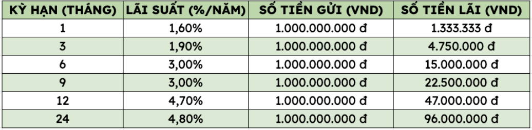 Như vậy, gửi 1 tỉ đồng tại VietinBank, khách hàng có thể nhận mức lãi cao nhất như sau (áp dụng với khách hàng cá nhân gửi trực tiếp tại quầy):