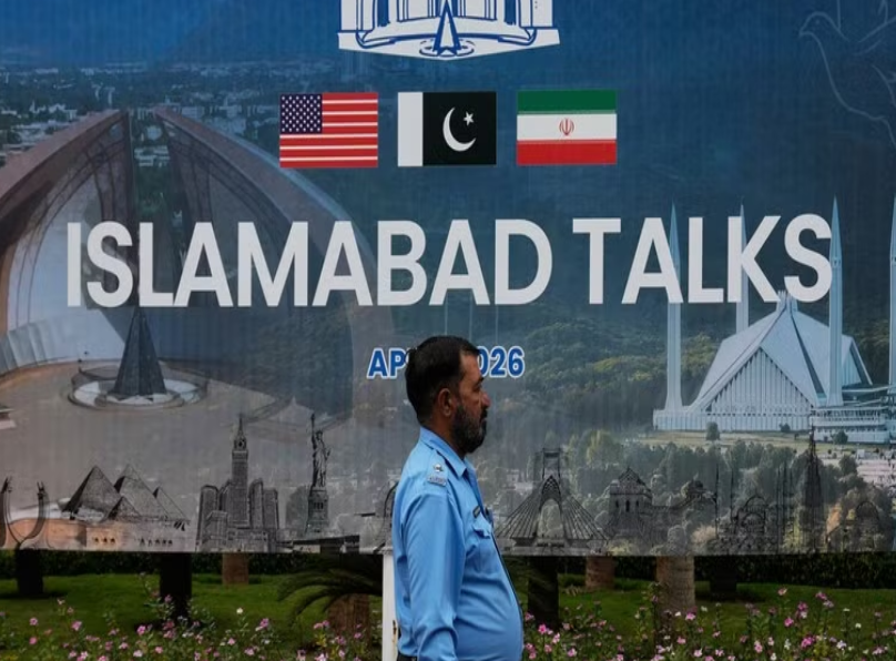 | Một biển quảng cáo về các cuộc đàm phán giữa Mỹ và Iran bên ngoài trung tâm hỗ trợ truyền thông, Islamabad, Pakistan, ngày 11/4. |
