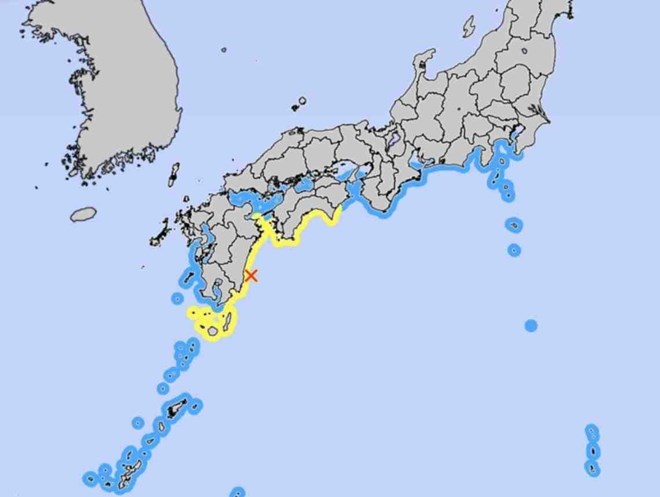 Cảnh báo sóng thần (màu vàng) được ban hành sau trận động đất ở Kyushu chiều 8.8. Ảnh: JMA