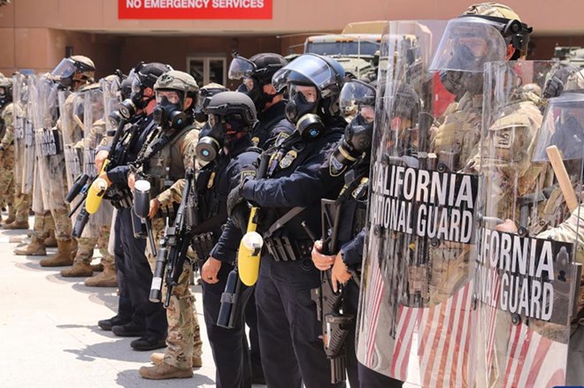 Các binh sĩ và cảnh sát của Lực lượng Vệ binh Quốc gia California đứng gác tại Trung tâm giam giữ liên bang Los Angeles, California (Mỹ), ngày 8.6.2025. Ảnh: Xinhua
