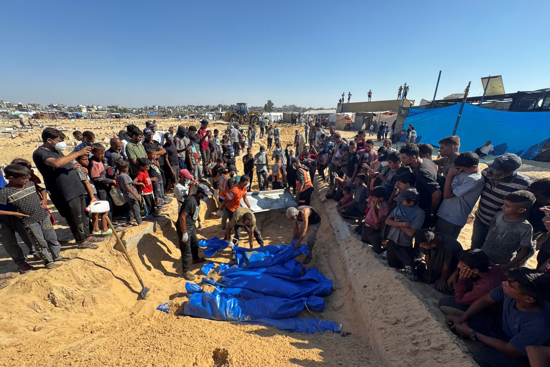 Người dân chôn cất tập thể các thi thể không xác định của người Palestine thiệt mạng trong cuộc tấn công quân sự của Israel, sau khi họ được Israel bàn giao, ở Khan Younis, phía nam Dải Gaza vào ngày 26 tháng 9 năm 2024. Ảnh: REUTERS /Mohammed Salem