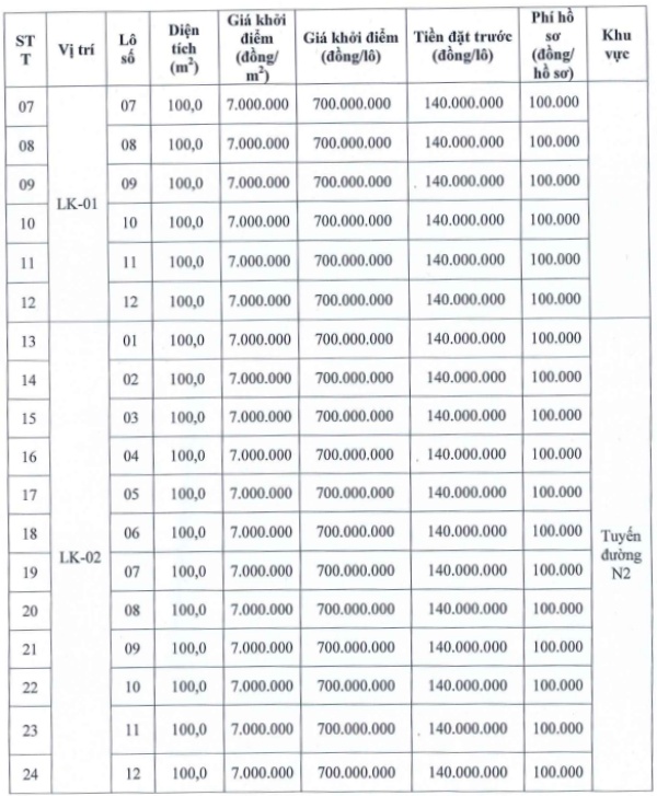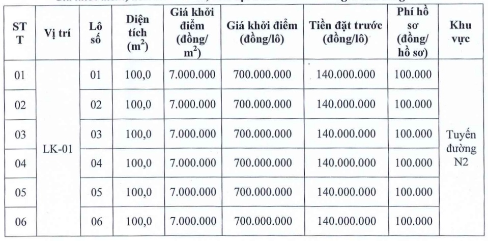 Bước giá áp dụng cho tất cả các lô đất đấu giá là 100.000 đồng/m2. Mức này được sử dụng làm căn cứ xác định giá trả hợp lệ của người tham gia.