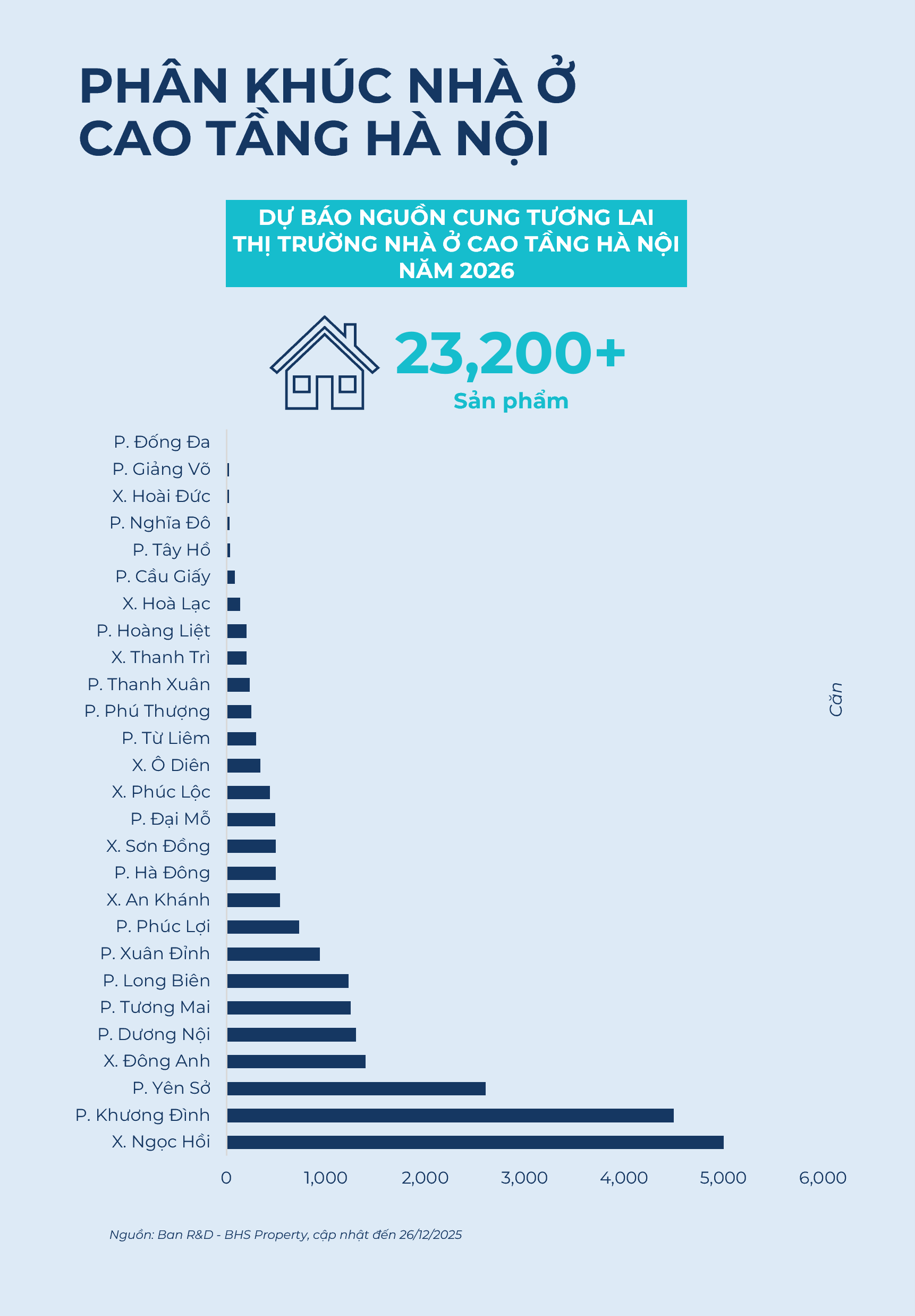 Hơn 23.000 sản phẩm nhà ở cao tầng dự kiến được ra mắt tại thị trường Hà Nội trong năm 2026 với các dự tiêu biểu gồm: Vinhomes Cao Xà Lá (P. Khương Đình, Vingroup), Lumière Plus Cổ Loa (X. Đông Anh, Masterise Homes), Vinhomes Olympic Hà Nội (X. Ngọc Hồi, Vingroup), Gamuda City - Central Residences (P. Yên Sở, Gamuda Land), An Bình Home Land (P. Dương Nội, CTCP Ngôi Sao An Bình - Tập đoàn Geleximco) cùng Rivea Residences (P. Tương Mai, Meyland). Trong đó, các dự án của Vinhomes và Masterise sẽ chiếm gần một nửa nguồn cung mới của toàn thị trường Hà Nội.