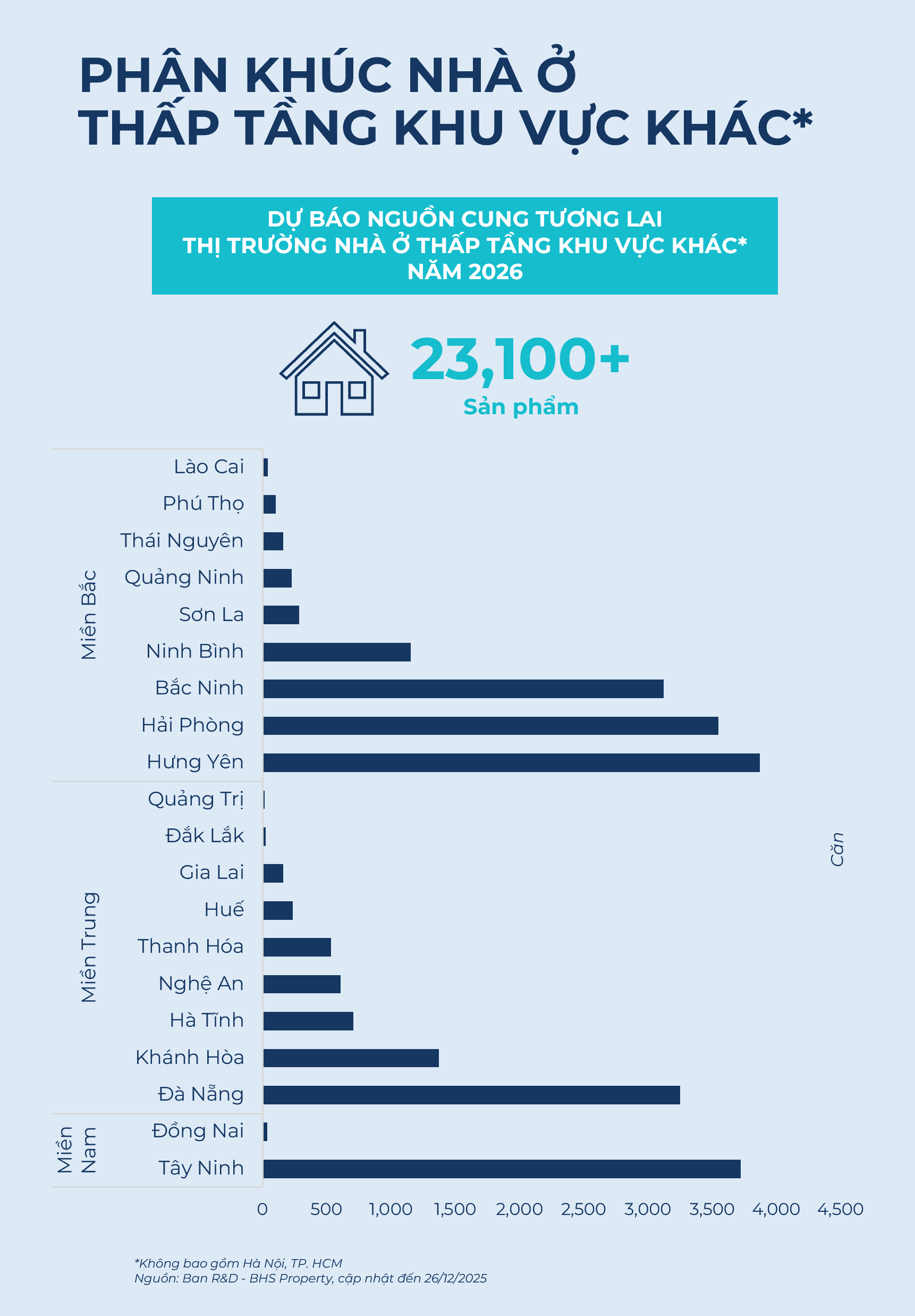 Bắc Ninh, Hải Phòng, Hưng Yên, Đà Nẵng, Tây Ninh sẽ là các thị trường đứng đầu nguồn cung trong năm 2026. Các dự án nhà ở thấp tầng tương lai tiêu biểu tại Việt Nam bao gồm Sun Bắc Ninh (Bắc Ninh, Sun Group), Alluvia City (Hưng Yên, Xuân Cầu Holdings), Vinhomes Hải Vân Bay (Đà Nẵng, Vingroup), Charmora City Nha Trang (Khánh Hòa, Sun Group), Dragon Eden (Tây Ninh, Tân Đô Land), cùng Vinhomes Cần Giuộc (Tây Ninh, Vingroup).