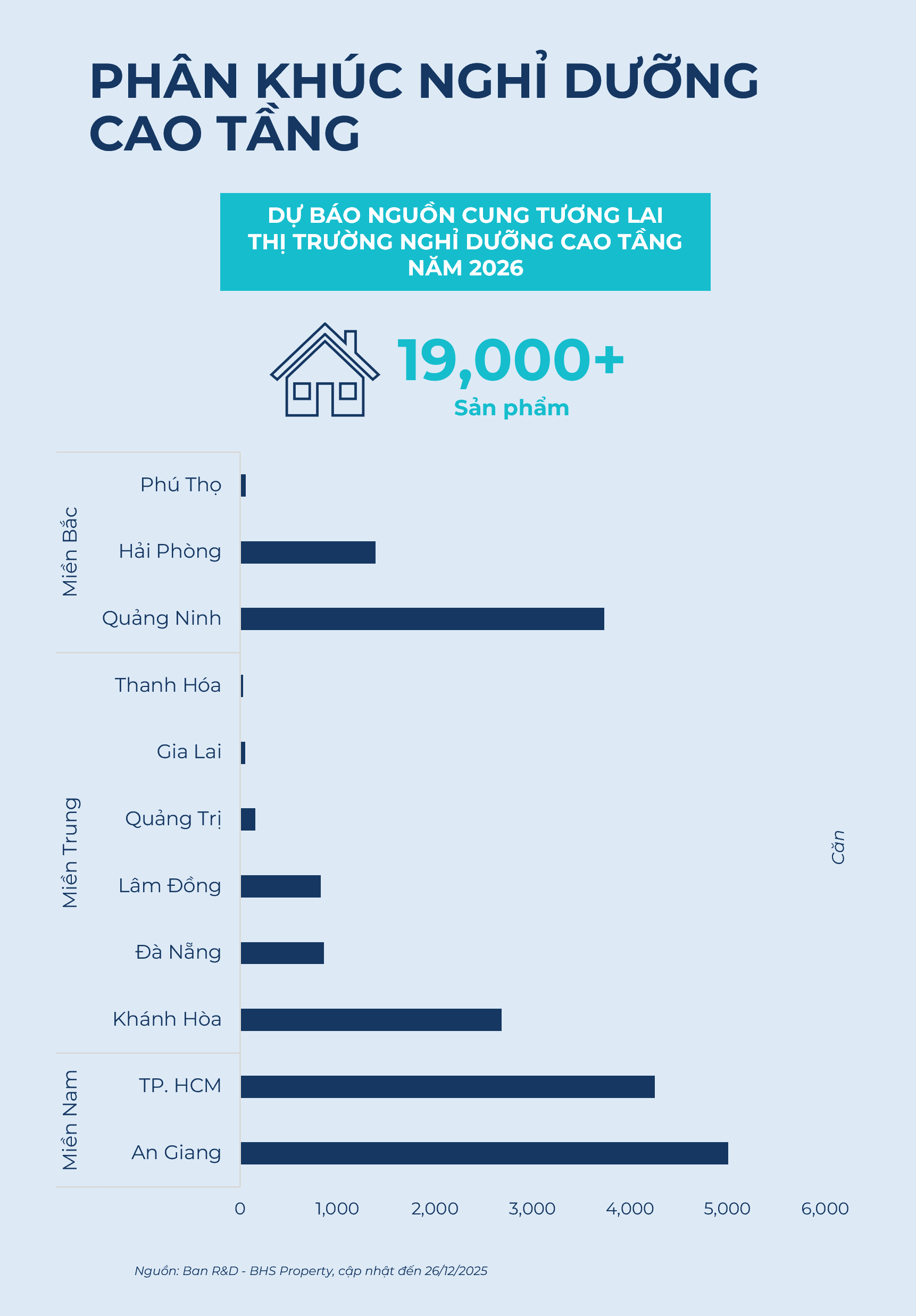 Các dự án nghỉ dưỡng cao tầng tương lai tiêu biểu trong năm 2026 bao gồm Sun Xan Island Cát Bà (Hải Phòng, Sun Group), Cararoworld Cam Ranh (Khánh Hòa - Cam Ranh, Công ty TNHH KN Cam Ranh), The Seahag Hotel & Resort (Lâm Đồng, Hải Phát Invest), Blanca City (TP. HCM, Sunshine Group), Sunshine Bay Retreat (TP. HCM, Sunshine Group), cùng The Sunset Phú Quốc (An Giang - Phú Quốc, Sun Group). Nguồn cung vẫn tập trung lớn ở An Giang và Quảng Ninh.