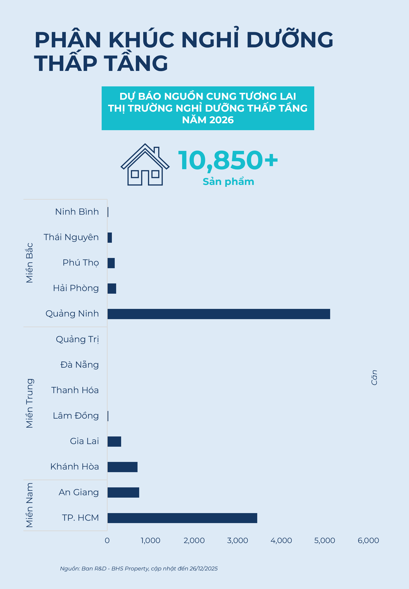Các dự án nghỉ dưỡng thấp tầng tương lai tiêu biểu năm 2026 bao gồm Vinhomes Apollo City (Quảng Ninh, Vingroup), Cararoworld Cam Ranh (Khánh Hòa - Cam Ranh, Công ty TNHH KN Cam Ranh), Sunshine Bay Retreat (TP. HCM, Sunshine Group), Gold Coast Vũng Tàu (TP. HCM - Vũng Tàu, Gold Coast Holdings), Selavia Phú Quốc (An Giang - Phú Quốc, TTC Group), cùng The Sunset Phú Quốc (An Giang - Phú Quốc, Sun Group). Quảng Ninh và TPHCM sẽ là 2 thị trường áp đảo nguồn cung lớn.