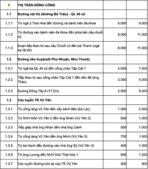 Xã Nông Cống trải dài tại nhiều xã, phường, giá đất ở bất động sản tại các khu vực từ 300.000-11 triệu đồng/m2. Đường nội thị (đường Bà Triệu) - Quốc lộ 45 cũ từ đường vào bệnh viện đa khoa đến phía bắc cầu chuối cũ, đoạn tiếp theo từ sau cầu Chuối cũ đến bà Thanh (ngã ba Quốc lộ 45).