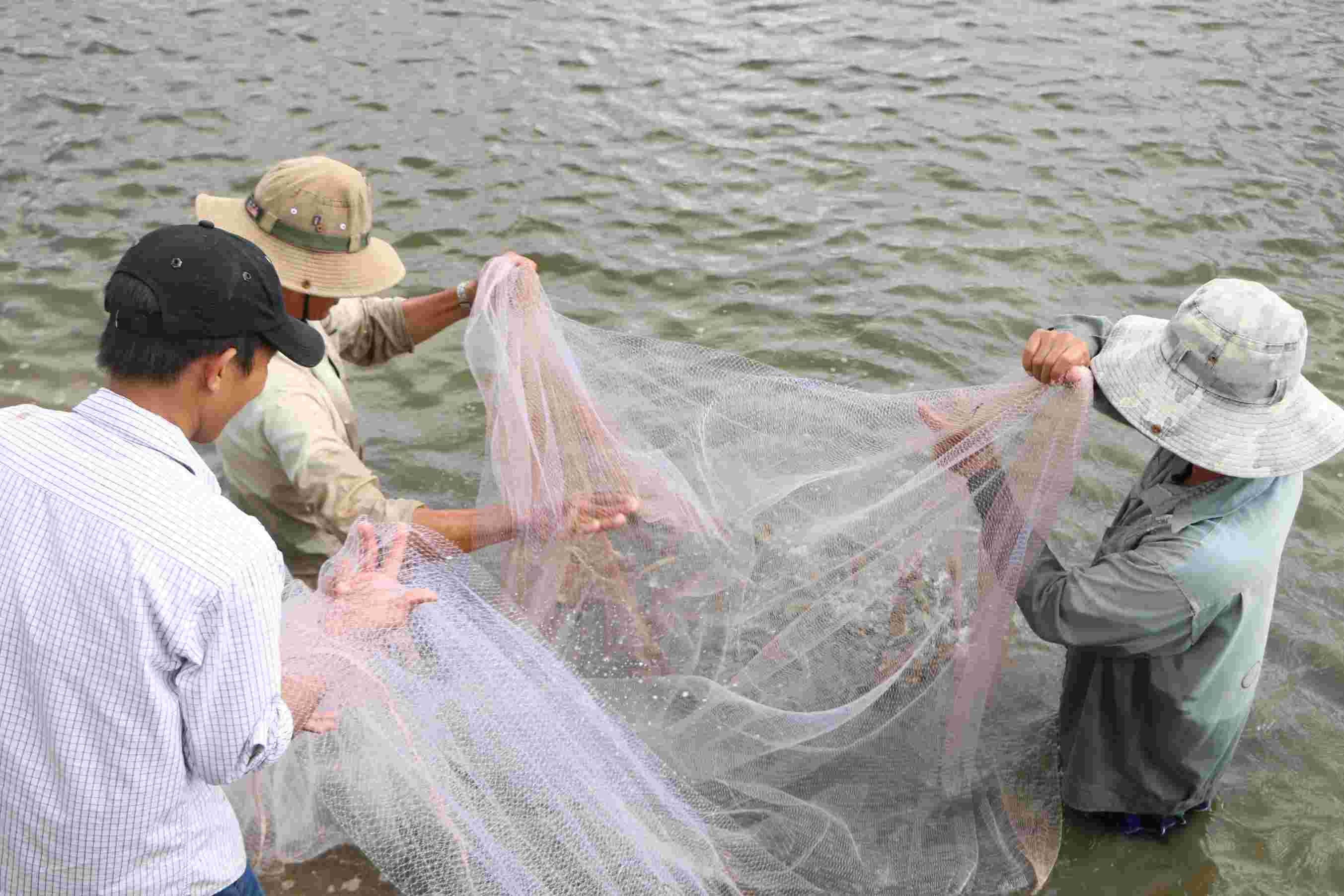 Kiểm tra tôm chuẩn bị thu hoạch ở Vĩnh Hậu, Cà Mau. Ảnh: Nhật Hồ