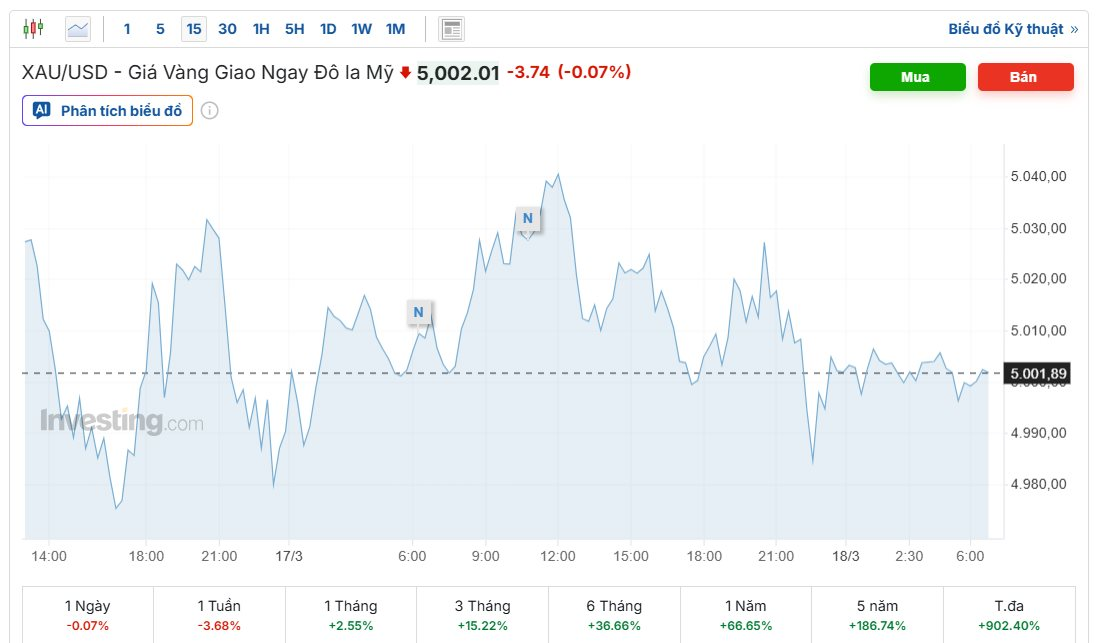 Theo dữ liệu từ Kitco và Trading Economics tính đến sáng ngày 18/03/2026, giá vàng giao ngay (spot gold) đang niêm yết quanh mức 5.001 USD/ounce. Trong phiên giao dịch đêm qua, đã có thời điểm vàng bứt phá lên mức cao nhất là 5.044 USD/ounce trước khi quay đầu điều chỉnh giảm khoảng 43 USD về vùng giá hiện tại.