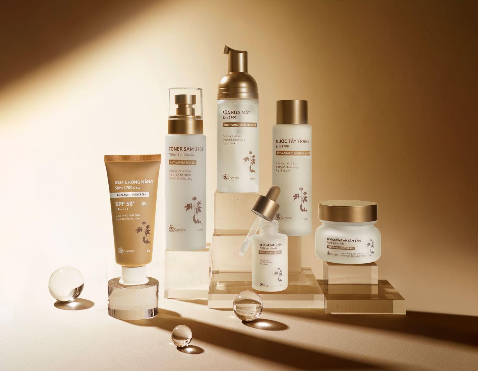 Bộ sản phẩm Sâm 1700 gồm 5 sản phẩm: Sữa rửa mặt, Tẩy trang, Toner, Kem dưỡng ẩm và Serum Sâm 1700 ngừa lão hóa. Trong đó, nổi bật là sản phẩm Serum với công dụng cải thiện nếp nhăn và vết chân chim trên da, tăng cường độ đàn hồi, giúp da săn chắc hơn, khắc phục tình trạng da khô, sạm hoặc xỉn màu và làm mờ các đốm nâu nhờ combo chiết xuất Sâm/Ectoin/Bakuchiol: ngừa lão hóa, ngừa nếp nhăn cùng Peptide: cho da căng mượt, giảm nhăn. Đặc biệt, sản phẩm còn có combo tinh chất “vi diệu” giúp làm sáng và giảm đốm nâu là Niacinamide + tranexamic: làm sáng. Bộ sản phẩm có đầy đủ số công bố của Sở Y tế Hà Nội.