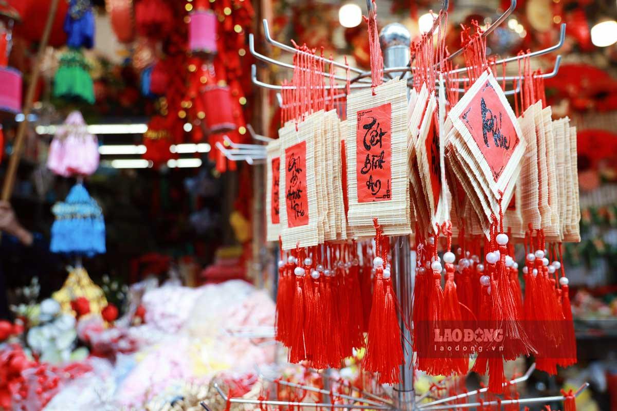 Lời chúc, câu đố đỏ, bánh chưng xanh là những món đồ trang trí không thể thiếu trong ngày Tết cũng được bày bán rất nhiều tại đây.