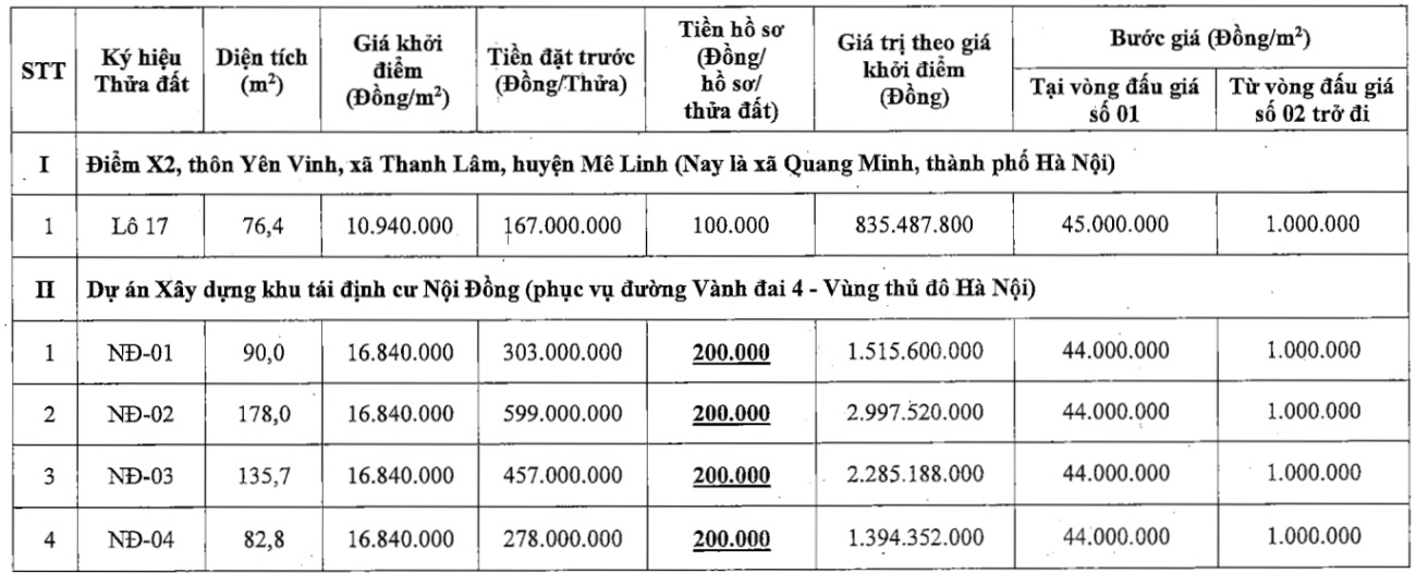 Bước giá áp dụng đối với lô đất tại điểm X2, thôn Yên Vinh, xã Thanh Lâm, huyện Mê Linh (nay là xã Quang Minh, thành phố Hà Nội) là 45.000.000 đồng/m2. Bước giá áp dụng cho vòng đấu giá số 2 trở đi là 1.000.000 đồng/m2.