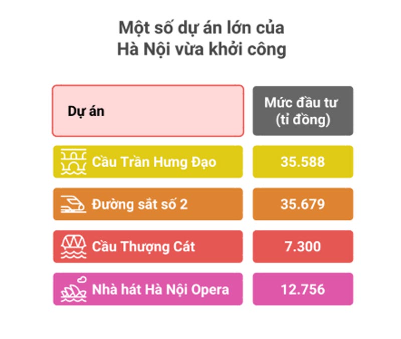 Song song với các dự án nêu trên, Thành phố Hà Nội cũng tổ chức khởi công nhiều dự án trọng điểm góp phần thay đổi diện mạo Thủ đô, gồm: Dự án đầu tư xây dựng Trường Đào tạo cán bộ Lê Hồng Phong; dự án đầu tư xây dựng Bệnh viện Thận Hà Nội (cơ sở 2) với quy mô 250 giường; dự án đầu tư xây dựng tuyến đường sắt đô thị thành phố Hà Nội số 2, đoạn Nam Thăng Long - Trần Hưng Đạo; dự án bồi thường, hỗ trợ, tái định cư, giải phóng mặt bằng thuộc nhóm dự án đầu tư xây dựng Quảng trường - công viên phía Đông hồ Hoàn Kiếm; dự án đầu tư xây dựng cầu Trần Hưng Đạo, kết nối khu vực trung tâm Hà Nội với khu vực phía Đông, hoàn thiện kết nối Đông - Tây của thành phố; dự án đầu tư xây dựng hầm chui tại nút giao Cổ Linh...