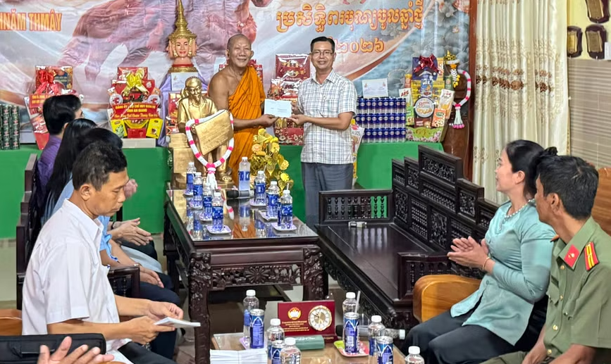 Dịp này, đoàn gửi quà chúc mừng Hòa thượng Chau Sơn Hy; trao tặng quà đến 12 người có uy tín trong vùng đồng bào dân tộc và 50 hộ bà con Khmer có hoàn cảnh khó khăn trên địa bàn xã, mỗi phần quà trị giá 1 triệu đồng thể hiện sự quan tâm của Đảng và Nhà nước đối với đời sống vật chất, tinh thần của đồng bào dân tộc thiểu số.