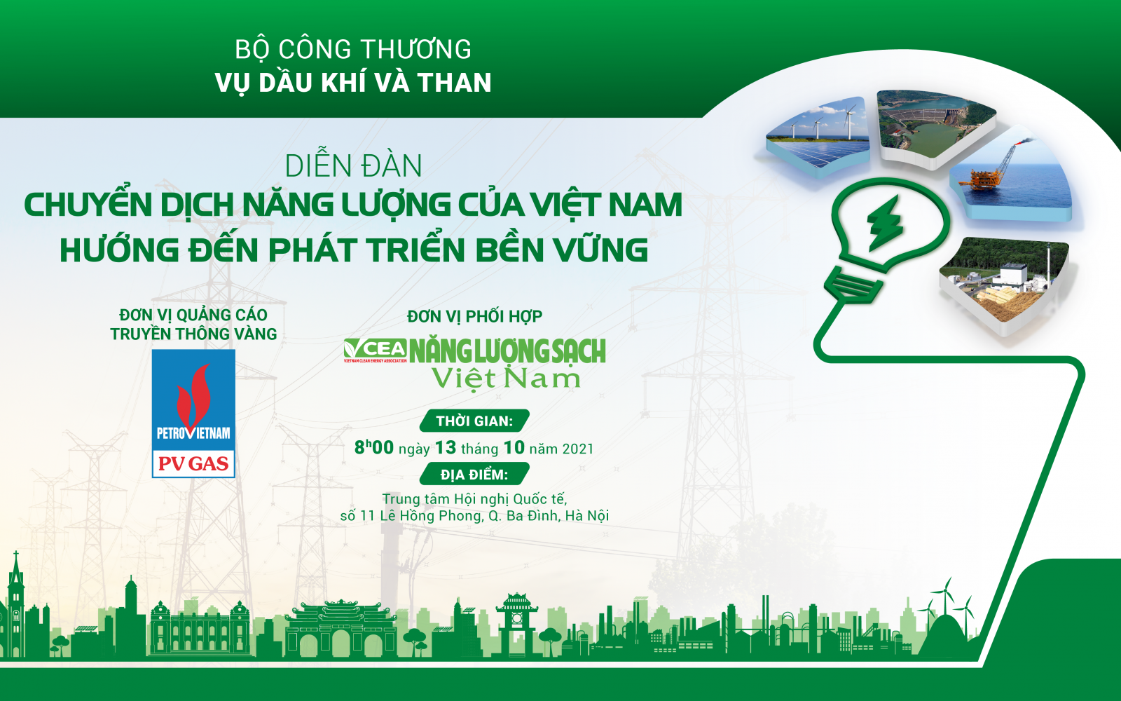 Nhằm bảo đảm vững chắc an ninh năng lượng quốc gia, đặc biệt trong bối cảnh nền kinh tế của Việt Nam và thế giới đang bị ảnh hưởng bởi dịch Covid -19; Vụ Dầu khí và Than – Bộ Công Thương phối hợp với Tạp chí Năng lượng sạch Việt Nam và các cơ quan liên quan tổ chức chương trình Diễn đàn “Chuyển dịch năng lượng của Việt Nam hướng đến phát triển bền vững”. Diễn đàn sẽ được tổ chức từ 8h00 – 12h00 ngày 13 tháng 10 năm 2021 tại Trung tâm Hội nghị Quốc tế, số 35 Hùng Vương, Quận Ba Đình, Hà Nội theo hình thức trực tiếp và trực tuyến.