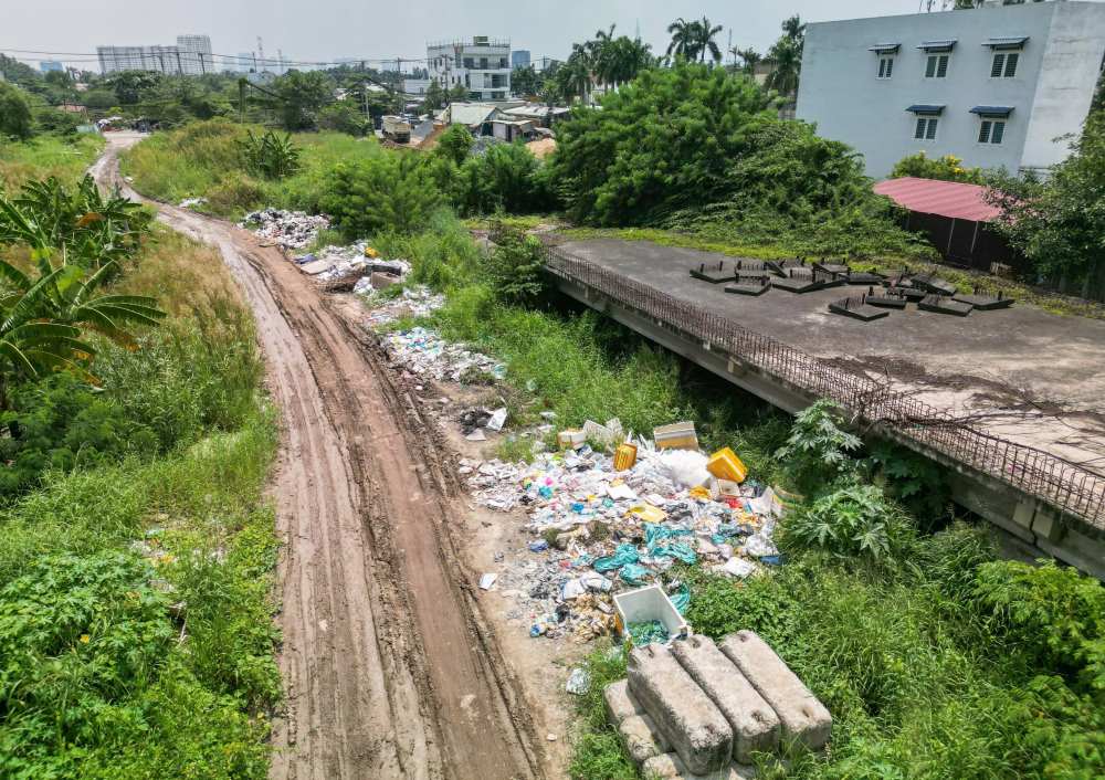 TPHCM - Sau 5 năm ngưng trệ, đoạn 3 đường Vành đai 2 ghi nhận đầy rác thải, cỏ dại. Dự án sẽ tái khởi công cuối tháng 10.