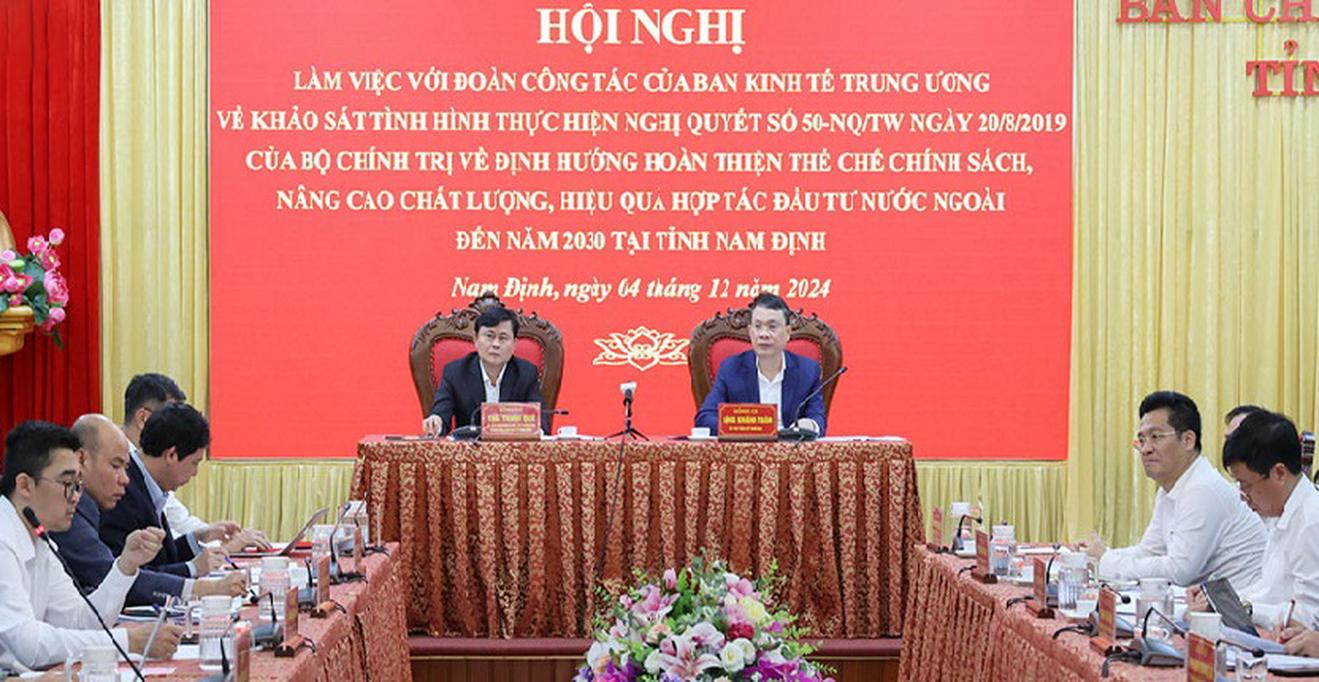 Đoàn công tác của Ban Kinh tế Trung ương vừa có buổi làm việc với Tỉnh ủy Nam Định về kết quả thực hiện Nghị quyết số 50-NQ/TW ngày 20/8/2019 của Bộ Chính trị về định hướng hoàn thiện thể chế, chính sách, nâng cao chất lượng, hiệu quả hợp tác đầu tư nước ngoài đến năm 2030.