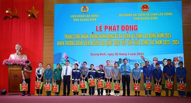 Các hoạt động "Tháng Công nhân", "Tháng hành động về An toàn, vệ sinh lao động" năm 2024 tỉnh Quảng Bình với nhiều nội dung được triển khai như chương trình “Đưa nghị quyết đại hội vào cuộc sống”; “Đối thoại tháng 5”; “Cảm ơn người lao động”…; tổ chức “Tháng cao điểm phát triển đoàn viên, thành lập công đoàn cơ sở”; Hoạt động tôn vinh đoàn viên, người lao động có thành tích xuất sắc trong lao động sản xuất, công tác; Giám sát, phối hợp thanh tra, kiểm tra về ATVSLĐ…